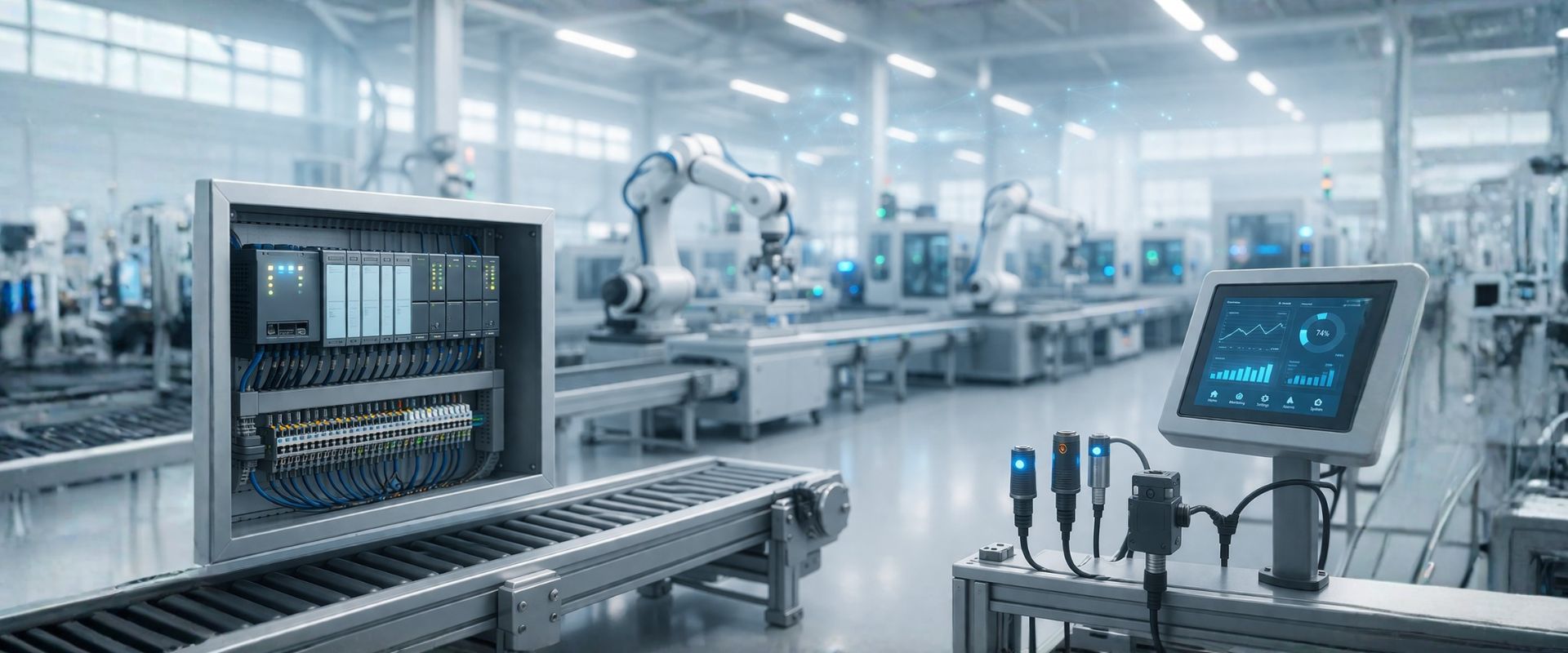Explore PLC, VFD, photoelectric sensors, rotary encoders, temperature controllers, safety light curtains, SMPS, and relays used in industrial automation.