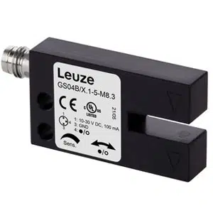 The Leuze GS04B/P.1-5-M8.3 fork sensor detects 0.2 mm parts using infrared LED light within a 5 mm opening accurately. This Leuze Fork Sensor operates on 10–30 V DC, provides a PNP transistor output rated at 100 mA, and supports a 10,000 Hz switching frequency through an M8 3-pin connector. It belongs to the GS Series and includes 100 µm switching hysteresis, a 0.05 ms response time, and IP67 protection.